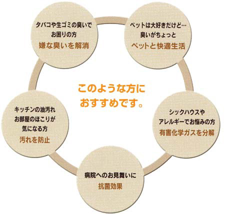 さらには、ホルムアルデヒドや有害な化学ガスを分解してアレルギーの原因をなくす<環境浄化>の働きがあります。