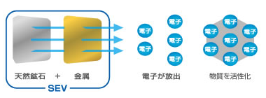 SEVは、微弱なエネルギ-を発する「天然鉱石」と「数十種類以上の金属」を組み合わせて、電子を発生させています。この電子がSEV特有の電子的作用を発生させ、対象物を活性化させます。